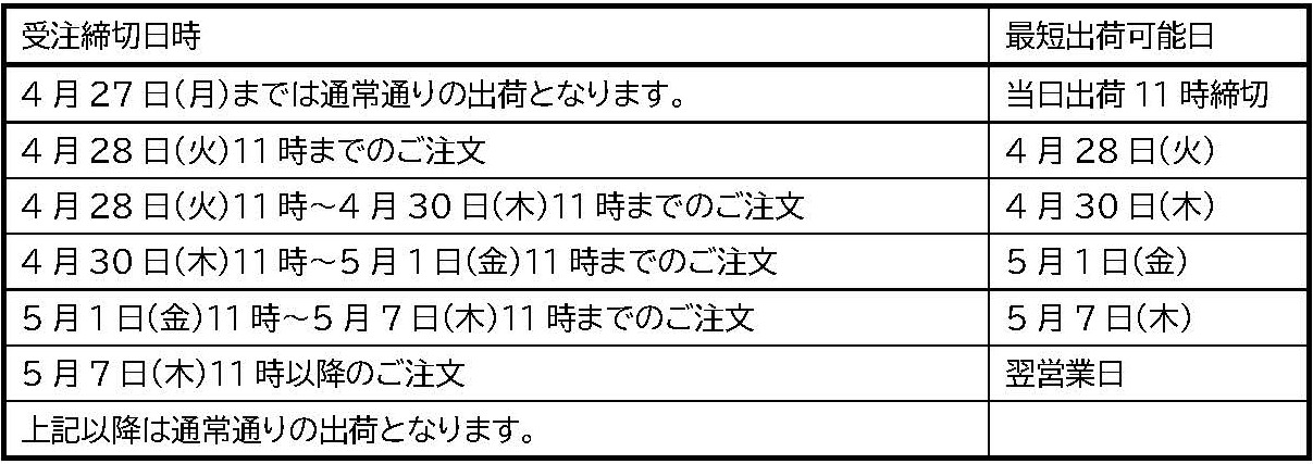 誠に勝手ながら、ゴールデンウイーク休業に関してご案内申し上げます。また、受注締切及び発送につきましてもご連絡いたします。何卒、ご高承のうえ、ご協力くださいますようよろしくお願い申し上げます。