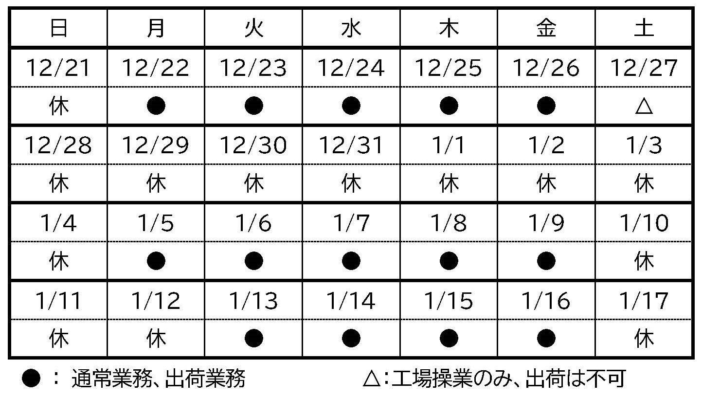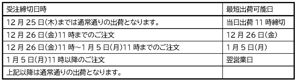 誠に勝手ながら、年末年始休業に関してご案内申し上げます。また、受注締切及び発送につきましてもご連絡いたします。何卒、ご高承のうえ、ご協力くださいますようよろしくお願い申し上げます。